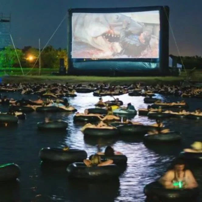 Just like watching an outdoor screening of “Jaws” on a big screen while floating with hundreds of other people in inner tubes in a murky pond at night.
