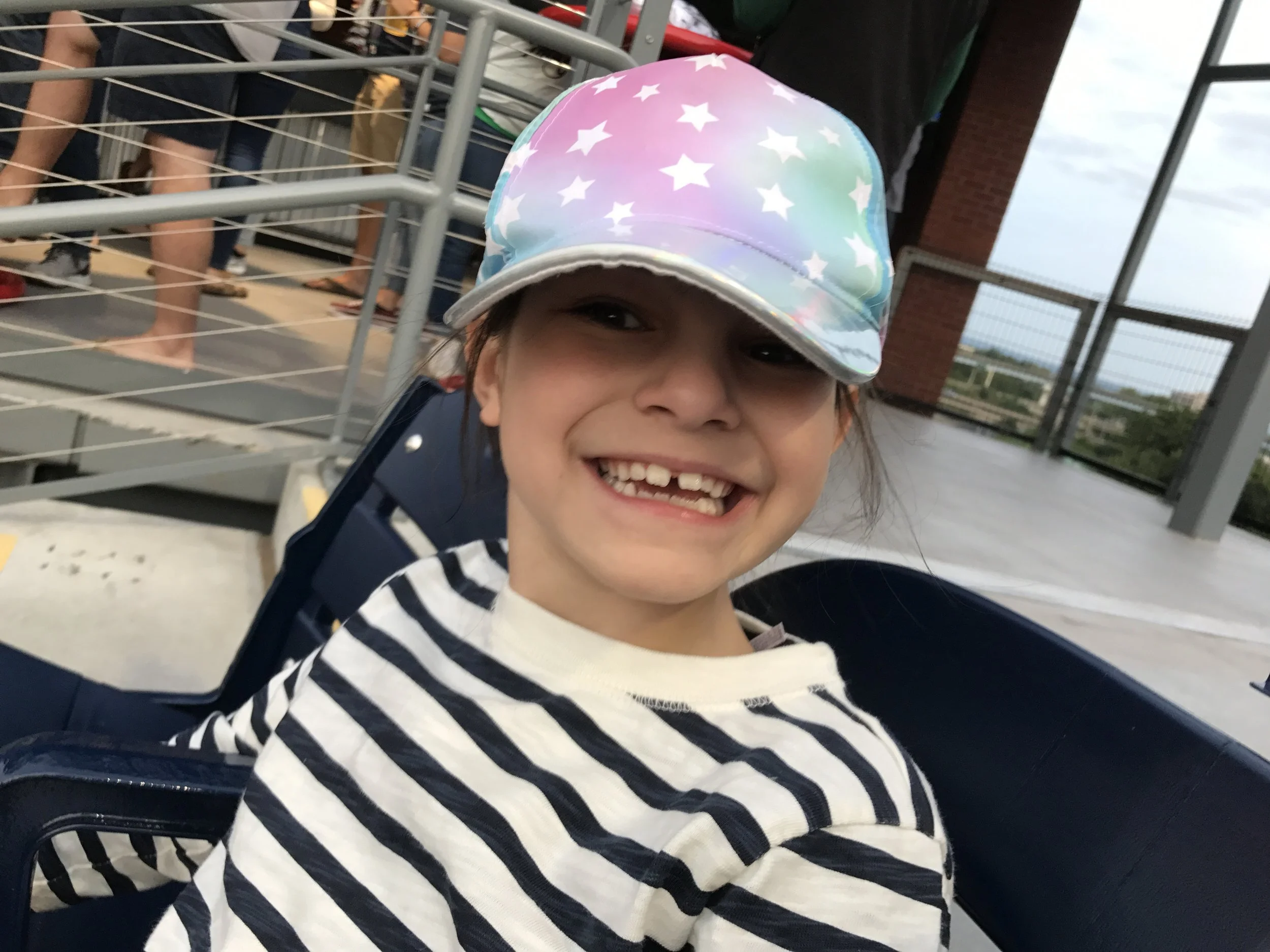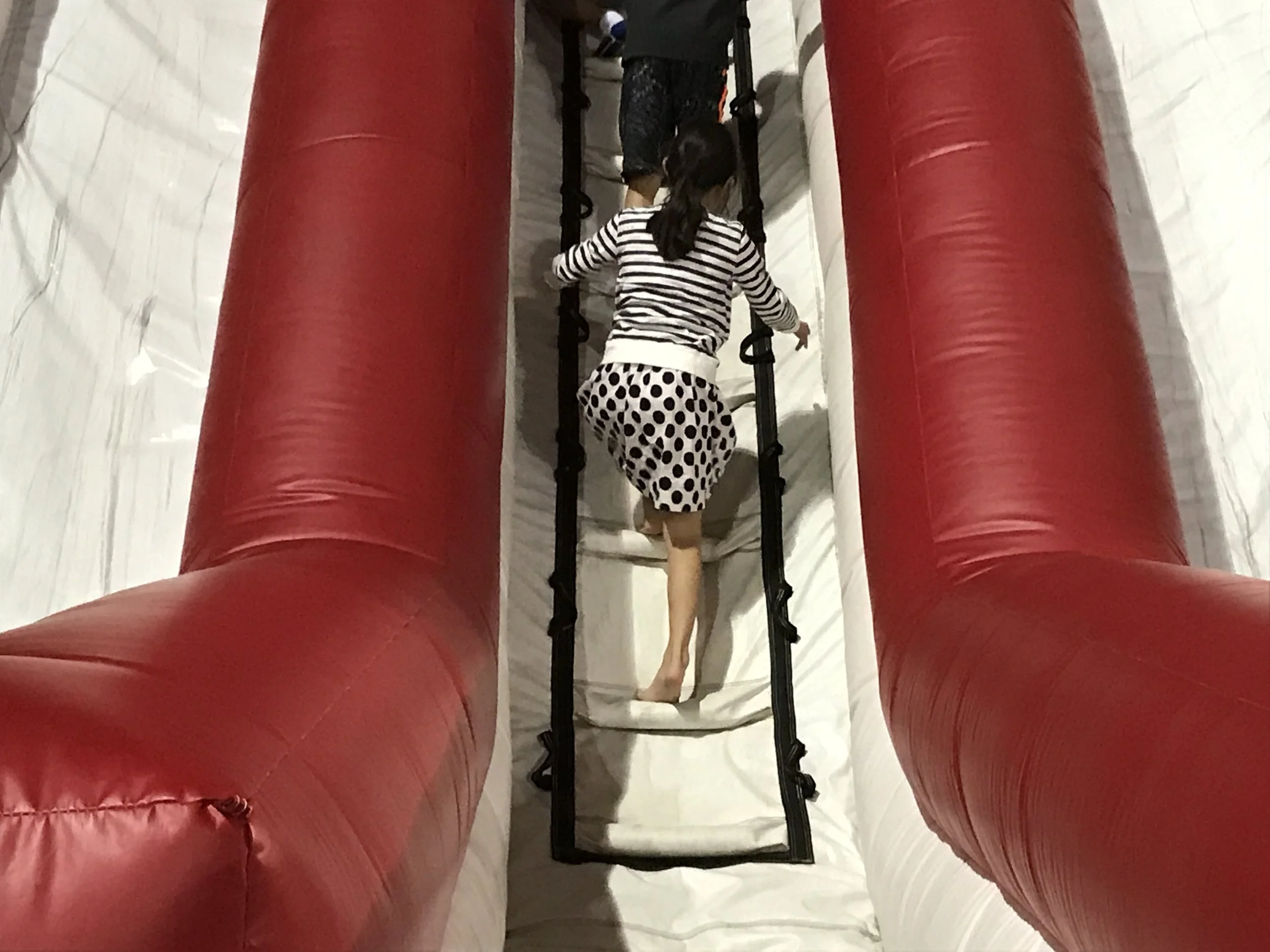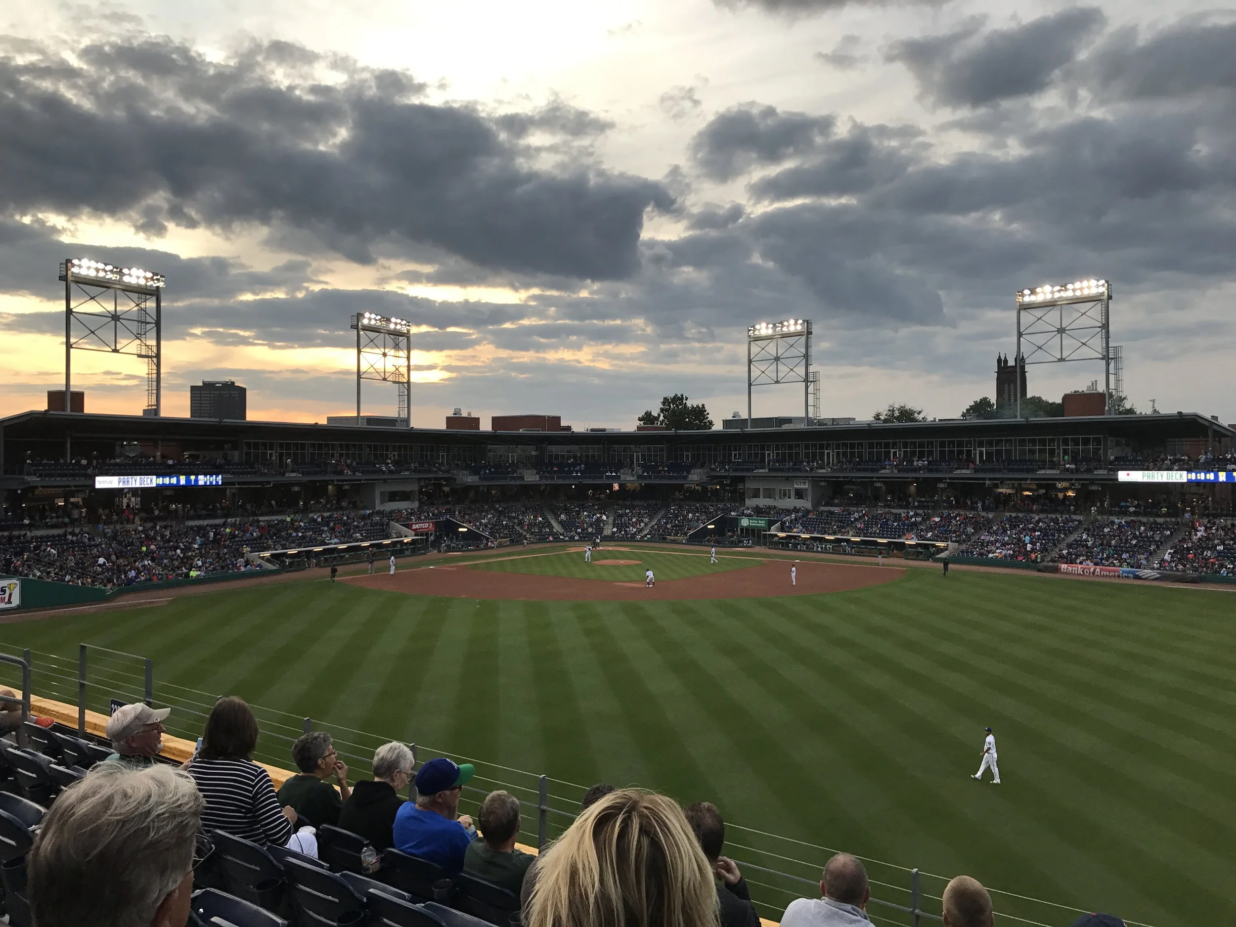 It’s the top of the seventh at the Hartford Yard Goats last night, which means we have abandoned our seats for rides on the enormous, inflatable slides behind the right field fence.
