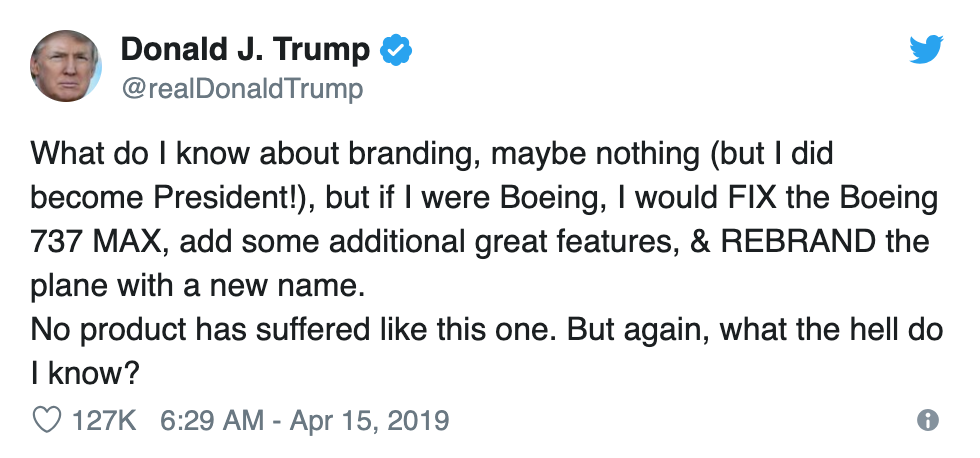 This is a man who bankrupted an airline in the late 1980’s and has had his name removed from a multitude of buildings since becoming President, but still, he believes that he has the answer to Boeings struggles. Fix the plane, add some great features, and “REBRAND.”