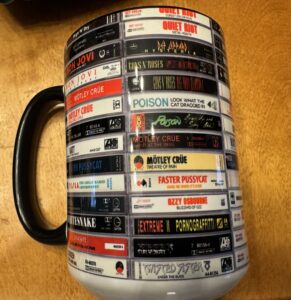 - A mug — a terrible gift for a man who has never tasted coffee or tea in his life — except this one has images of cassette tapes from my youth, including bands like Poison, Tesla, Faster Pussycat, Extreme, Dokken, and more. Whoever designed this clearly lived my teenage years alongside me.