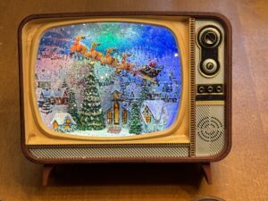 - A replica of an old tube TV with an animated Christmas scene inside. I saw these in a Christmas shop in Quebec City, but didn’t buy one even though I loved them. Four months later, Elysha had one under the tree for me.